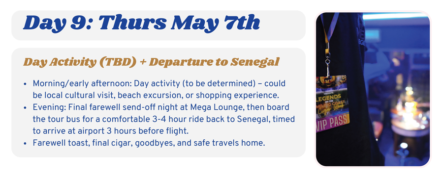 Mega Legend Cigar Week 2026 is an immersive, luxury travel experience designed for cigar enthusiasts who appreciate premium moments, meaningful connections, and unforgettable destinations. Set against the vibrant backdrop of Senegal and The Gambia, this nine-day journey blends world-class cigars, rich African culture, and curated social experiences into one legendary adventure.